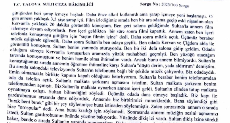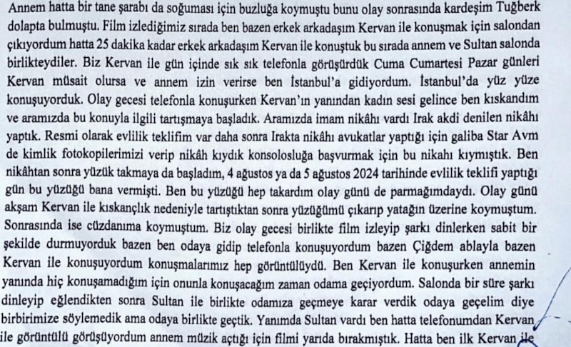 Şirince'ye gittiğinden beri şarap içmeye başladı. Daha önce alkol kullanırdı ama şarap içmeye yeni başlamıştı. O gün annem yaklaşık 3,5 şişe şarap içti. Film izlediğimiz sırada ben bir ara odama geçip eski nişanlım olan Kervan’la yaklaşık 20 dakika görüntülü konuştum. Ben geri salona geldiğimde Sultan’la annem film izlemeye devam ediyorlardı. Ben içeri geldikten bir süre sonra filmi kapattık.