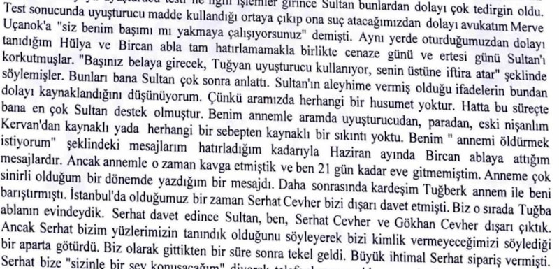 Bunları bana Sultan çok sonra anlattı. Sultan’ın aleyhime vermiş olduğu ifadelerin bundan dolayı kaynaklandığını düşünüyorum. Çünkü aramızda herhangi bir husumet yoktur. Hatta bu süreçte bana en çok Sultan destek olmuştur. Benim annemle aramda uyuşturucudan, paradan, eski nişanlım Kervan’dan kaynaklı ya da herhangi bir sebepten kaynaklı bir sıkıntı yoktu.
