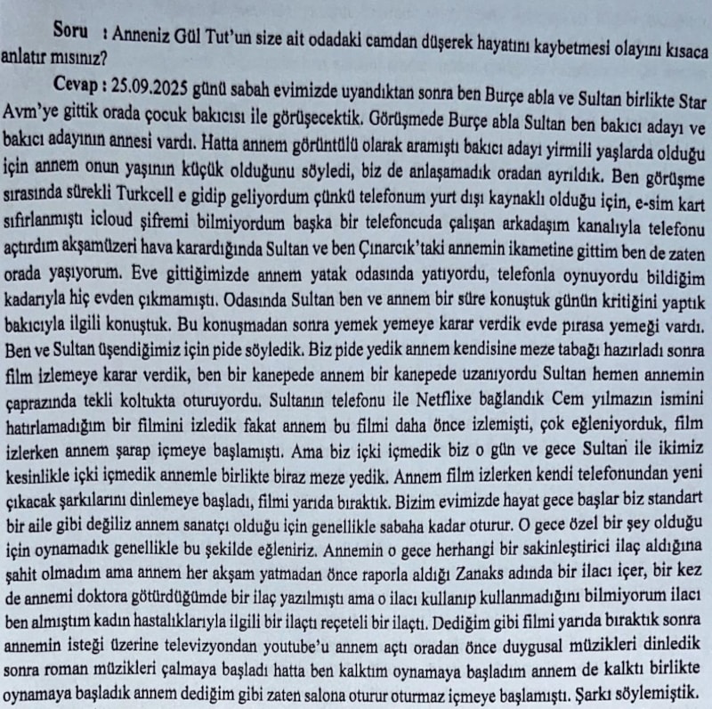 İlk polis merkezinde verdiğim ifademe okuduğunuz üzere “annem gül oynadığı sırada bir anda ayağı kaydı ve açık olan camdan aşağı düştü” gibi bir ifade var ama ben nasıl ifade verdiğimi ve ne söylediğimi hatırlamıyorum çünkü ben hastanede yoğun diyazem gibi sakinleştiriciler almıştım o zaman ne söylediğimi hatırlamıyorum şu anki ifadem daha doğrudur.