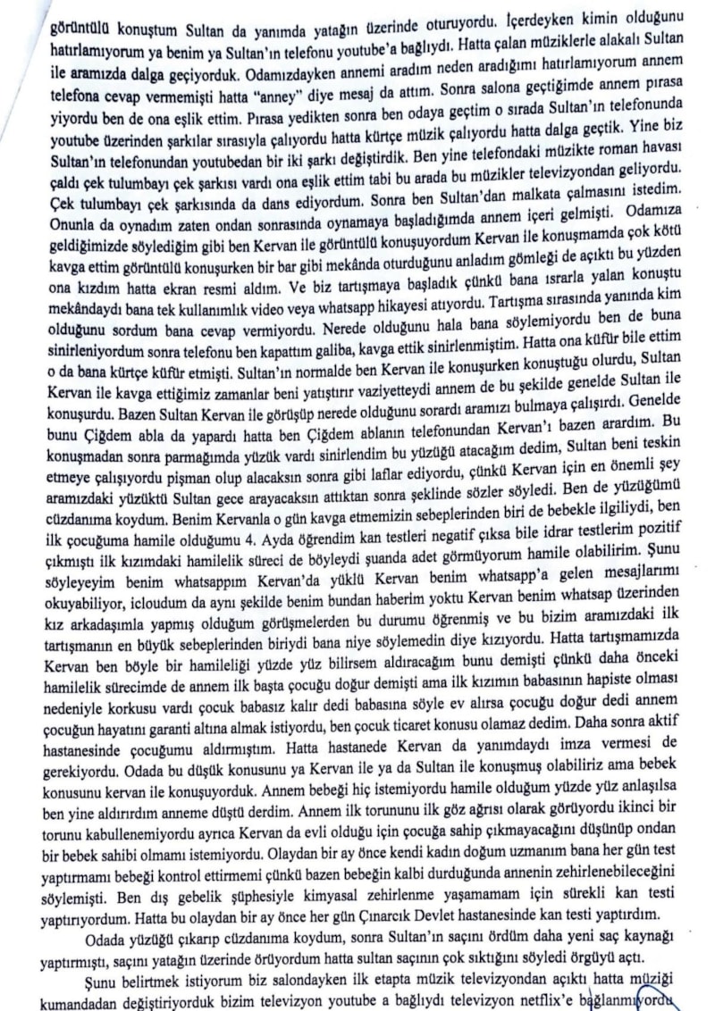 Ben odada Kervan ve Çiğdem abla ile görüntülü konuştum. Sultan benim yanımda oturuyordu. Ben iki defa salona gidip geldim. Odada Kervan’la konuşurken aramızda yüzük muhabbeti geçmişti. Ben yüzüğü atacağım tarzında konuşmuştum ve benim hamile olma ihtimalim vardı. Ancak bunu annem bilmiyordu. Sultan’la konuştuğumuz sırada annemin öğrenme ihtimaline karşı Sultan’a “düştü derim, yada aldırırım” demiştim.