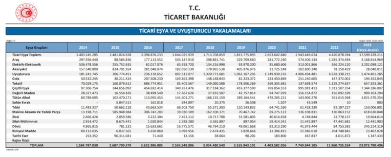 Ekipler, 3 milyar 202 milyon 98 bin 121 lira değerinde elektronik eşya, 28 milyon 40 bin 11 lira değerinde akaryakıt, 194 milyon 352 bin 845 lira değerinde gıda, 657 milyon 353 bin 361 lira değerinde tekstil, 909 milyon 203 bin 294 lira değerinde maden, 1 milyar 21 milyon 570 bin 254 lira değerinde tütün ve alkol, 153 milyon 6 bin 801 lira değerinde tıbbi eşya, 618 milyon 630 bin 848 lira değerinde makine aksamı ve yedek parça, 19 milyon 664 bin 614 lira değerinde zirai ürün, 12 milyon 441 bin 903 lira değerinde silah ve mühimmat, 245 milyon 214 bin 319 lira değerinde döviz, 23 milyon 402 bin 828 lira değerinde kimyevi madde, 1 milyon 347 bin 433 lira değerinde tarihi eser ele geçirdi.