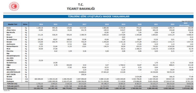 Ticaret Bakanlığı verilerine göre, geçen yıl 17 milyar 599 milyon 329 bin 211 lira değerinde kaçak ticari eşya, 5 milyar 474 milyon 461 bin 285 lira değerinde uyuşturucunun Türkiye'ye girmesine izin verilmedi.