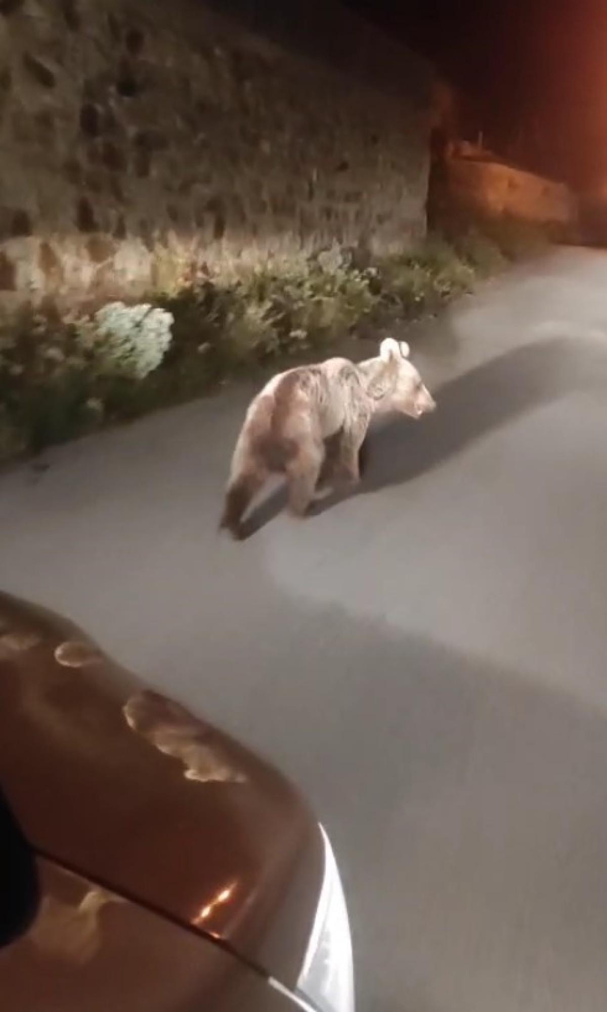 Gece saatlerinde ise ayılar, köy yolunda ilerleyen bir aracın farlarıyla karşılaşınca panikleyerek kaçmaya başladı.