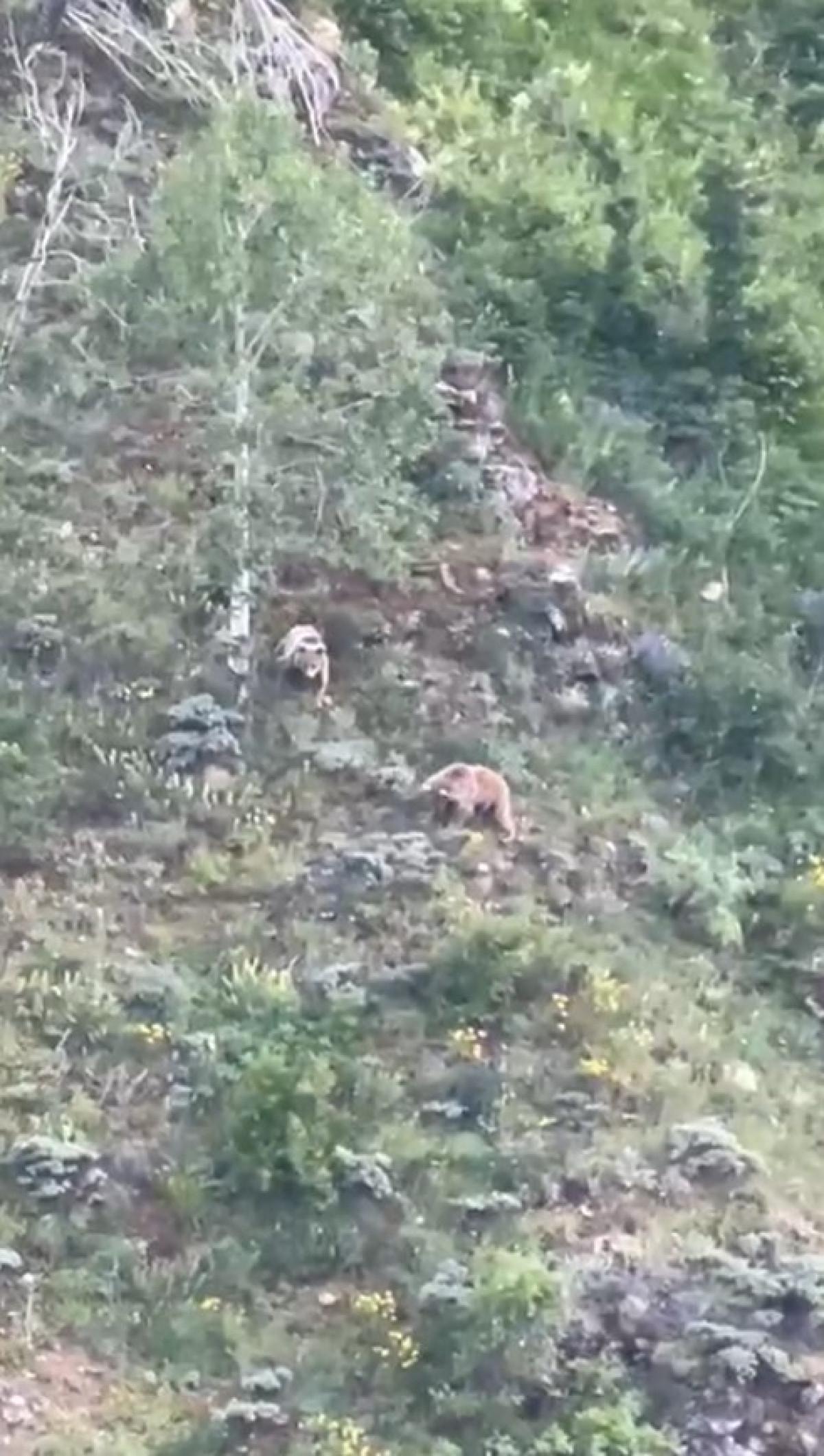 Gündüz saatlerinde dağlık alanda dolaşan ayılar, vatandaşlar tarafından cep telefonuyla kayda alındı.