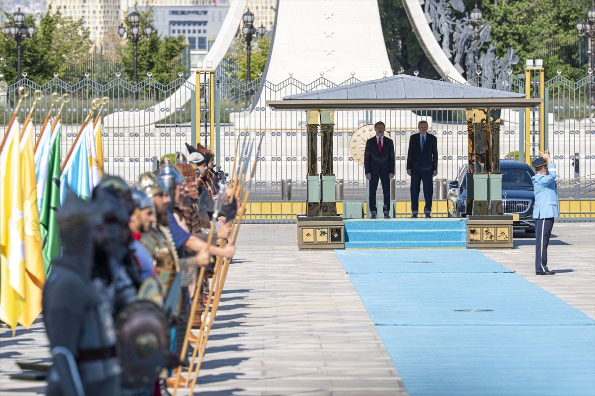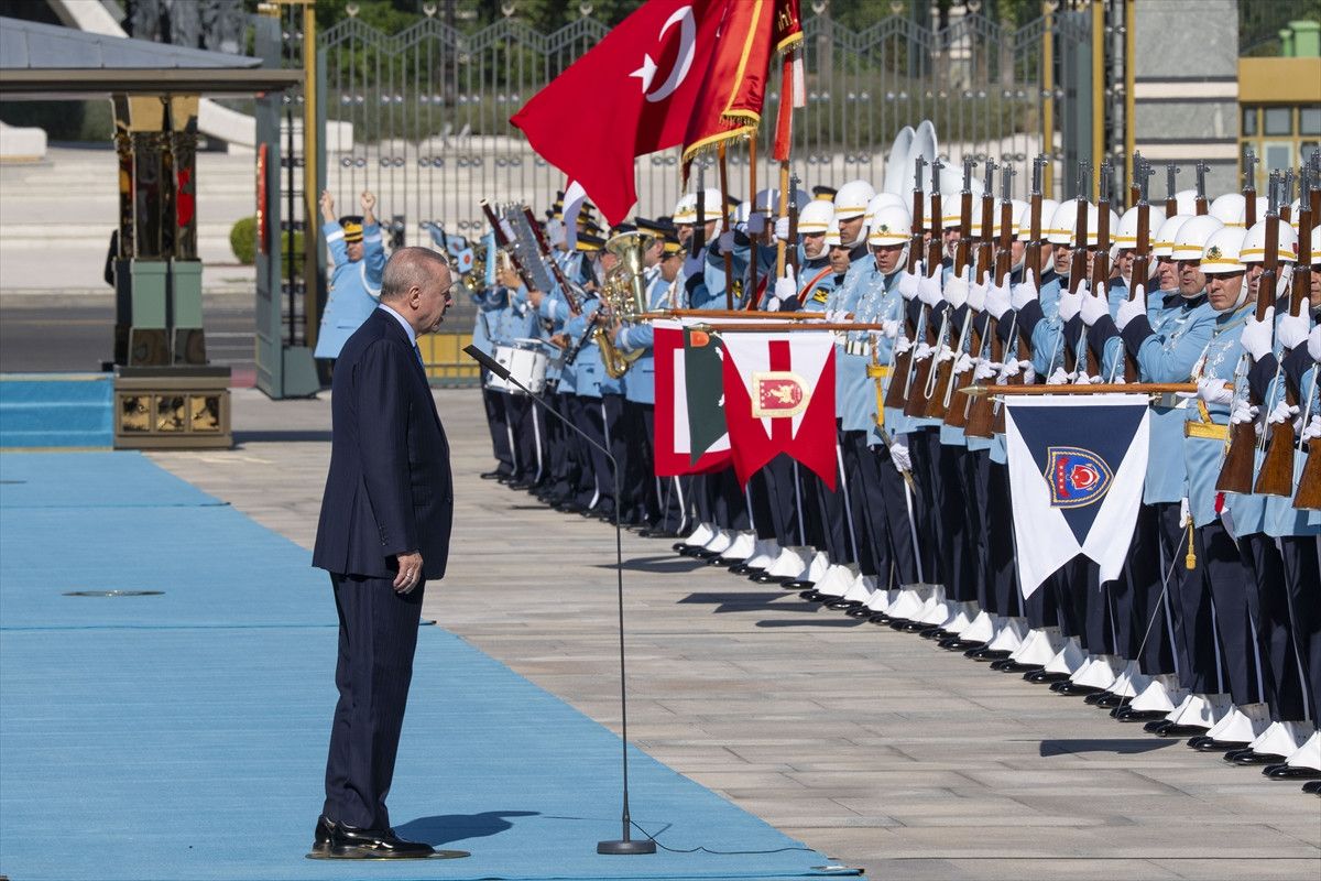 Cumhurbaşkanı Erdoğan ve Kavelashvili’nin tören alanındaki yerlerini almalarının ardından, 21 pare top atışı eşliğinde iki ülkenin milli marşları çalındı. Kavelashvili, Muhafız Alayı Tören Kıtası'nı 'Merhaba Asker' diyerek selamladı.