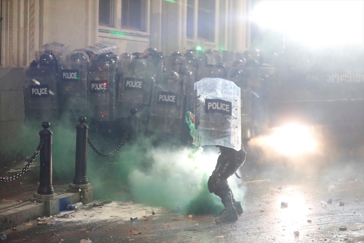 Başkent Tiflis'teki parlamento binası önünde toplanan protestocular, taş ve yabancı maddelerle demir barikatları hedef aldı.