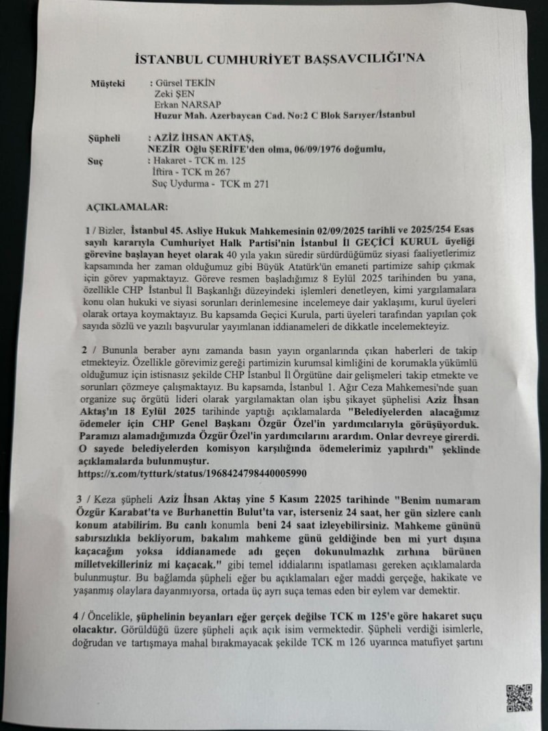 Bu kapsamda, İstanbul 1. Ağır Ceza Mahkemesi'nde şuan organize suç örgütü lideri olarak yargılamaktan olan işbu şikayet şüphelisi Aziz İhsan Aktaş'ın 18 Eylül 2025 tarihinde yaptığı açıklamalarda "Belediyelerden alacağımız ödemeler için CHP Genel Başkanı Özgür Özel'in yardımcılarıyla görüşüyorduk. Paramızı alamadığımızda Özgür Özel'in yardımcılarını arardım. Onlar devreye girerdi. O sayede belediyelerden komisyon karşılığında ödemelerimiz yapılırdı" şeklinde açıklamalarda bulunmuştur.