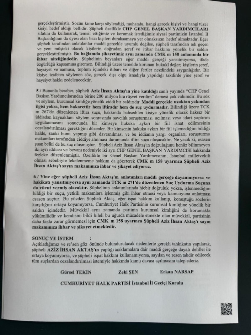 Bu yüzden Şüpheli Aktaş, eğer ispat hakkını kullanıp, konuştuğu sözlerin karşılığını ortaya koyamıyorsa, Cumhuriyet Halk Partisi'nin kurumsal kimliğine yönelik bir saldırı içindedir. Müvekkil aynı zamanda partinin kurumsal kimliğini de korumakla yükümlüdür ve kendisini bildi bileli bu uğurda mücadele etmekte olan müvekkil, partisinin daha fazla zarar görmemesi için CMK m 158 uyarınca Şüpheli Aziz İhsan Aktaş'ı sayın makamınıza ihbar ve şikayet etmektedir.