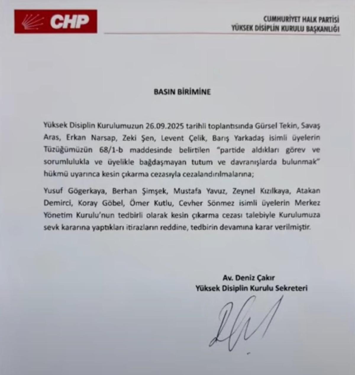 Bizimle aynı yolda yürüyen binlerce yol arkadaşımızın emeğini yok sayarak kendi düzenlerini sürdürmeye çalışanların vereceği hiçbir karar CHP tarihine gölge düşüremez. Bugün bizi ihraç edenler bilsinler ki aslında ihraç ettikleri biz değiliz; ihraç ettikleri kendi vicdanlarıdır, partinin onurlu geçmişidir. Bizim varlığımızı yok edemezsiniz. Çünkü biz CHP’nin vicdanıyız, kökleriyiz, hafızasıyız.