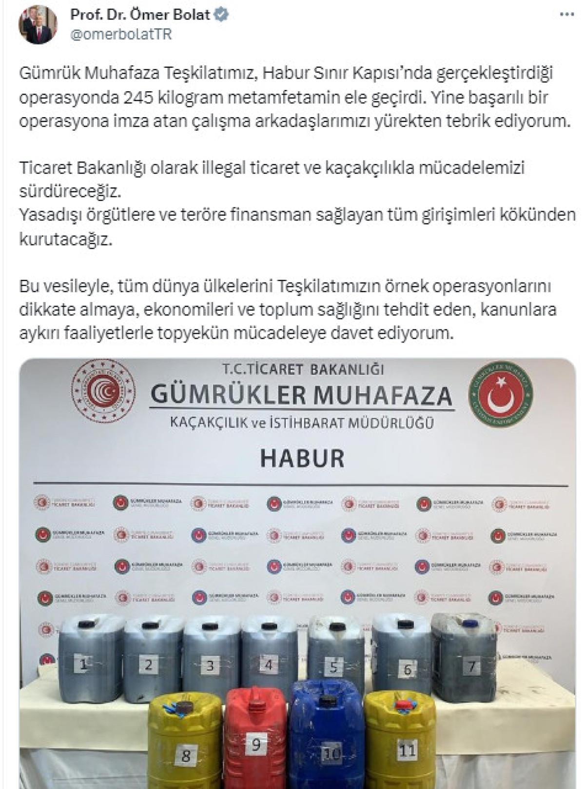 Gümrük Muhafaza Teşkilatımız, Habur Sınır Kapısı’nda gerçekleştirdiği operasyonda 245 kilogram metamfetamin ele geçirdi. Yine başarılı bir operasyona imza atan çalışma arkadaşlarımızı yürekten tebrik ediyorum.