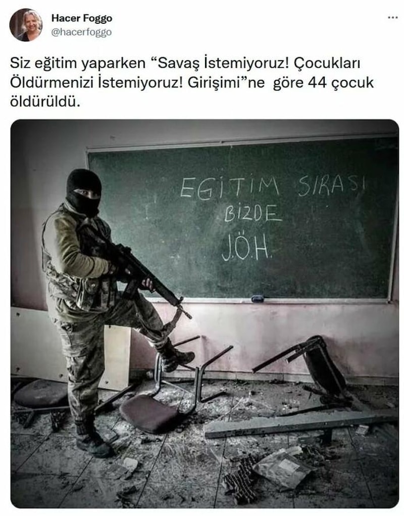 Jandarma Özel Harekat'ın Hendek operasyonları sırasında bir sınıfta çekilen ve tahtada "Eğitim sırası bizde J.Ö.H" ifadelerinin yer aldığı bir fotoğrafı paylaşan Foggo, şu notu eklemişti:
