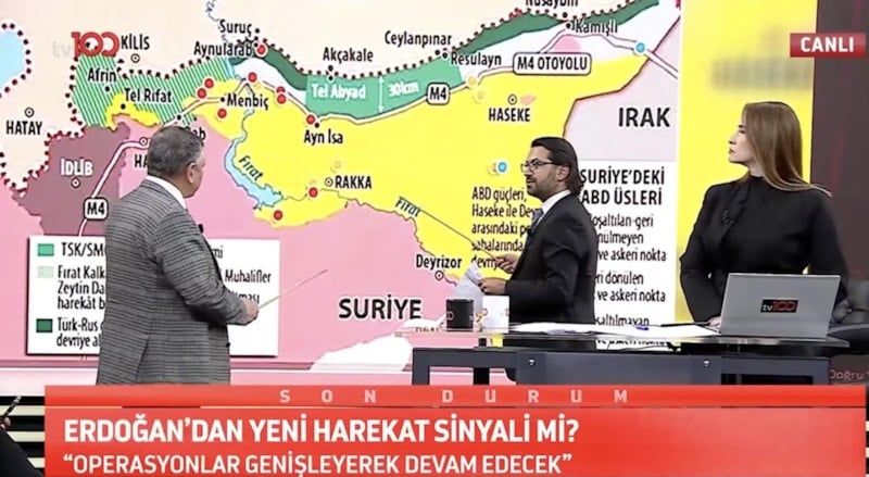 "Giydikleri elbise aynı. İkisinin beslendiği yer aynı. Operasyonlar genişler mi? Sayın Bahçeli’nin 60 kilometre dediği alan. Şurası 30 kilometre bir 30 kilometre daha derinliğe gidecek aşağı doğru. Bu arada biz neredeyiz Fırat’ın doğusu batısı. Şu Fırat dediğiniz yer neresi? İsrail’in Büyük Orta Doğu Projesi. İsrail’in BOP içinde kim var? Türkiye var. Şuralarda Türk askerinin bayrağı dalgalanıyor. Dolayısıyla 30 kilometre daha aşağı indiğiniz zaman İsrail’in de emellerine aykırı davranmış oluyor. Şuranın genişlemesi yeni bir şey değil. Üst düzey komutanlarımızla oturup konuştuğumuzda zaten planlarımız 60-70 kilometre aşağı inip burayı güvenli hale getirmek diyorlardı. Ve şu anda Sayın Bahçeli bunu dediğine göre, operasyonlar genişleyecek mi? Kara harekatı olacak mı? Kara harekatı olarak değil her halükarda yürüyen operasyonlar aşağı doğru inecek. Ordu kara harekatındaki gibi yan yana dizilip gitmeyecek ama üs bölgelerimiz genişleyerek 60 kilometreye Türkiye inecek. Bunun zaten olması gerekiyor, şu anda zaten 30 kilometre aşağı inmiş."