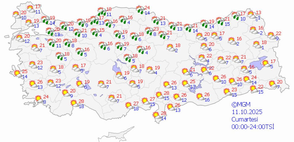 Yayınlana rapora göre; cumartesi günü yurdun genelinde yağış, pazar ise daha güneşli bir hava bekleniyor.