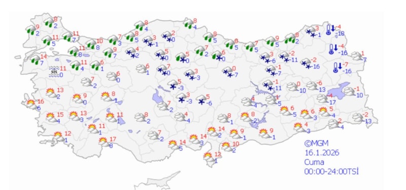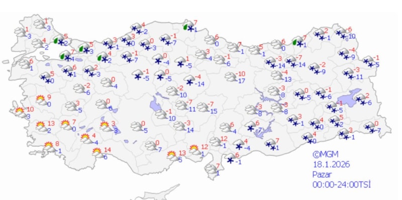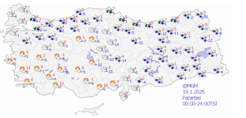 AKOM'un sosyal medya hesabından paylaşılan haftalık hava tahmin raporunda, 18 Ocak Pazar ve 19 Ocak Pazartesi günleri karla karışık yağmurun beklendiği belirtilen raporda, en düşük ve en yüksek hava sıcaklıklarının pazar günü 2/5, pazartesi günü ise 3/6 olacağının öngörüldüğü aktarıldı.