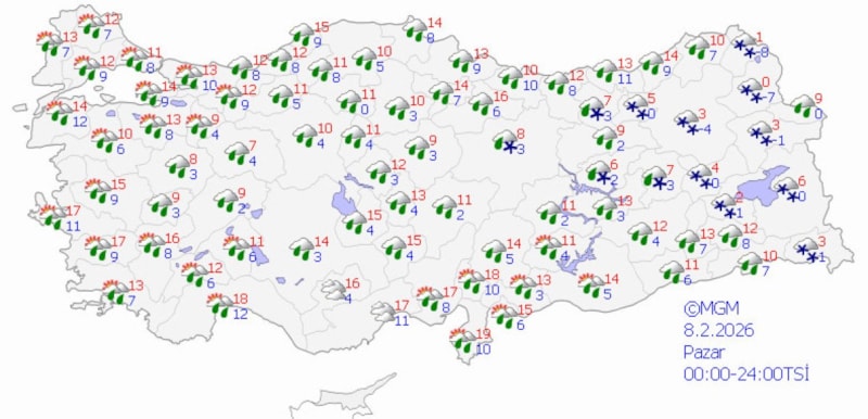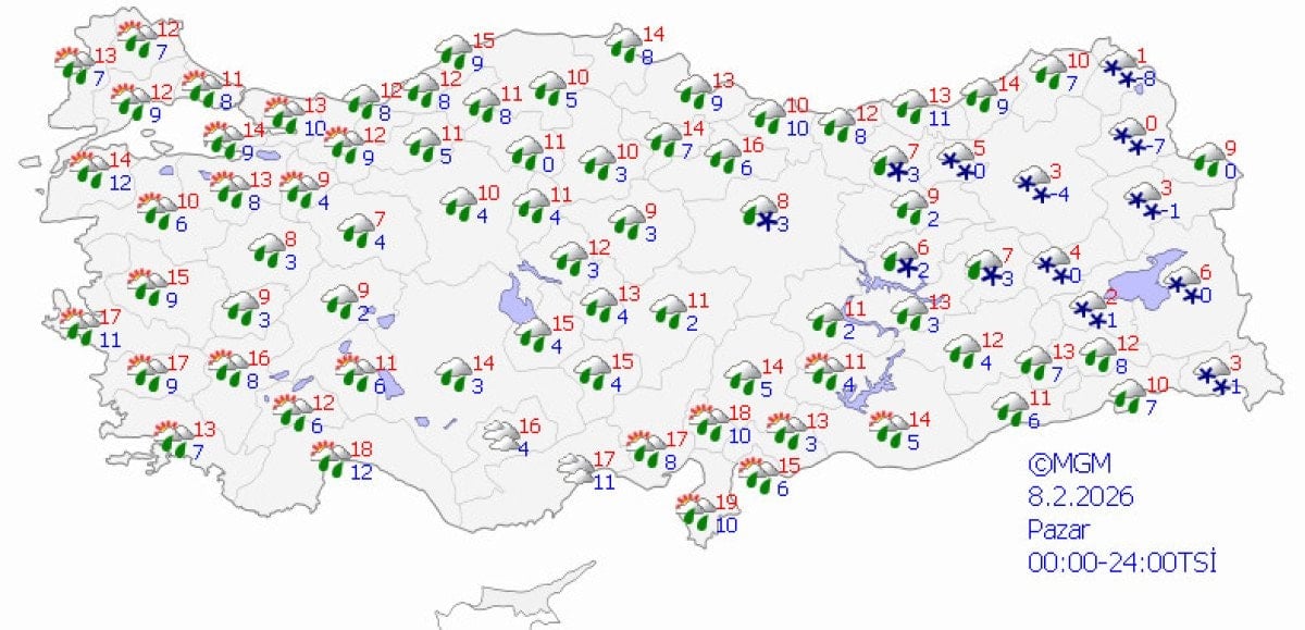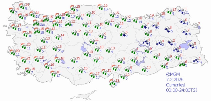 Pazar günü ise Mersin ve Karaman dışında yağışların yurt genelinde devam edeceğini belirten Özdemirci, Doğu Karadeniz'in iç kesimleri, Doğu Anadolu'nun kuzey ve doğusunda karla karışık yağmur ve kar yağışı beklendiğini vurgularken İstanbul, Ankara ve İzmir'de hafta sonu boyunca yağışlı havanın etkili olacağını söyledi.