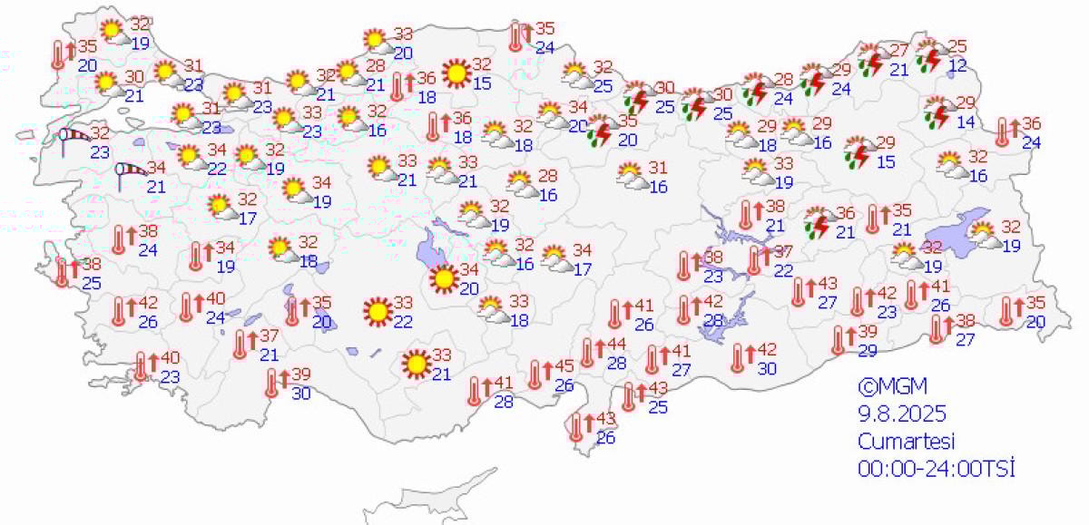 Meteoroloji Genel Müdürlüğü'nün (MGM) 5 günlük hava tahmin haritalarına göre, Türkiye'de 9-13 Ağustos 2025 tarihleri arasında sıcaklıklar mevsim normallerinin üzerinde seyredecek.