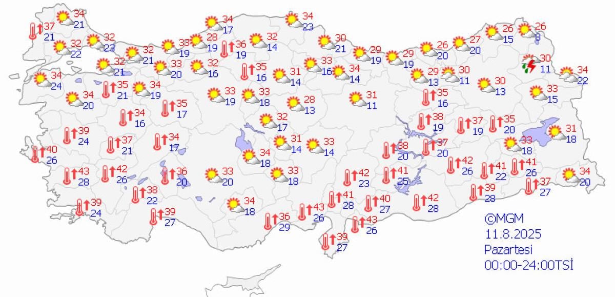 10 Ağustos Pazar gününden itibaren sıcaklıkların kuzey bölgelerde hafif düşüş göstereceği, ancak iç ve güney bölgelerde 35-40 derece bandında devam edeceği öngörülüyor.