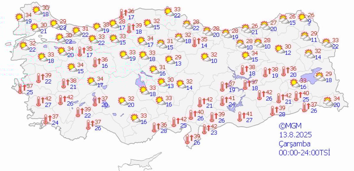13 Ağustos Çarşamba günü ise hava sıcaklıkları genel olarak 20-35 derece arasında olacak.