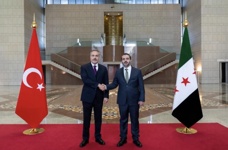 Bakan Fidan, Milli Savunma Bakanı Yaşar Güler, MİT Başkanı İbrahim Kalın ile gittiği Başkent Şam'da, Suriye Devlet Başkanı Ahmed Şara ile bir araya geldi.