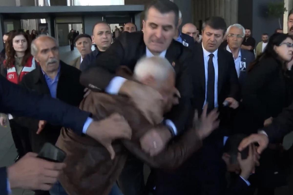 Özgür Özel'in kafasına yumruk atan şahıs, korumalar tarafından etkisiz hale getirilip polislere teslim edildi.
