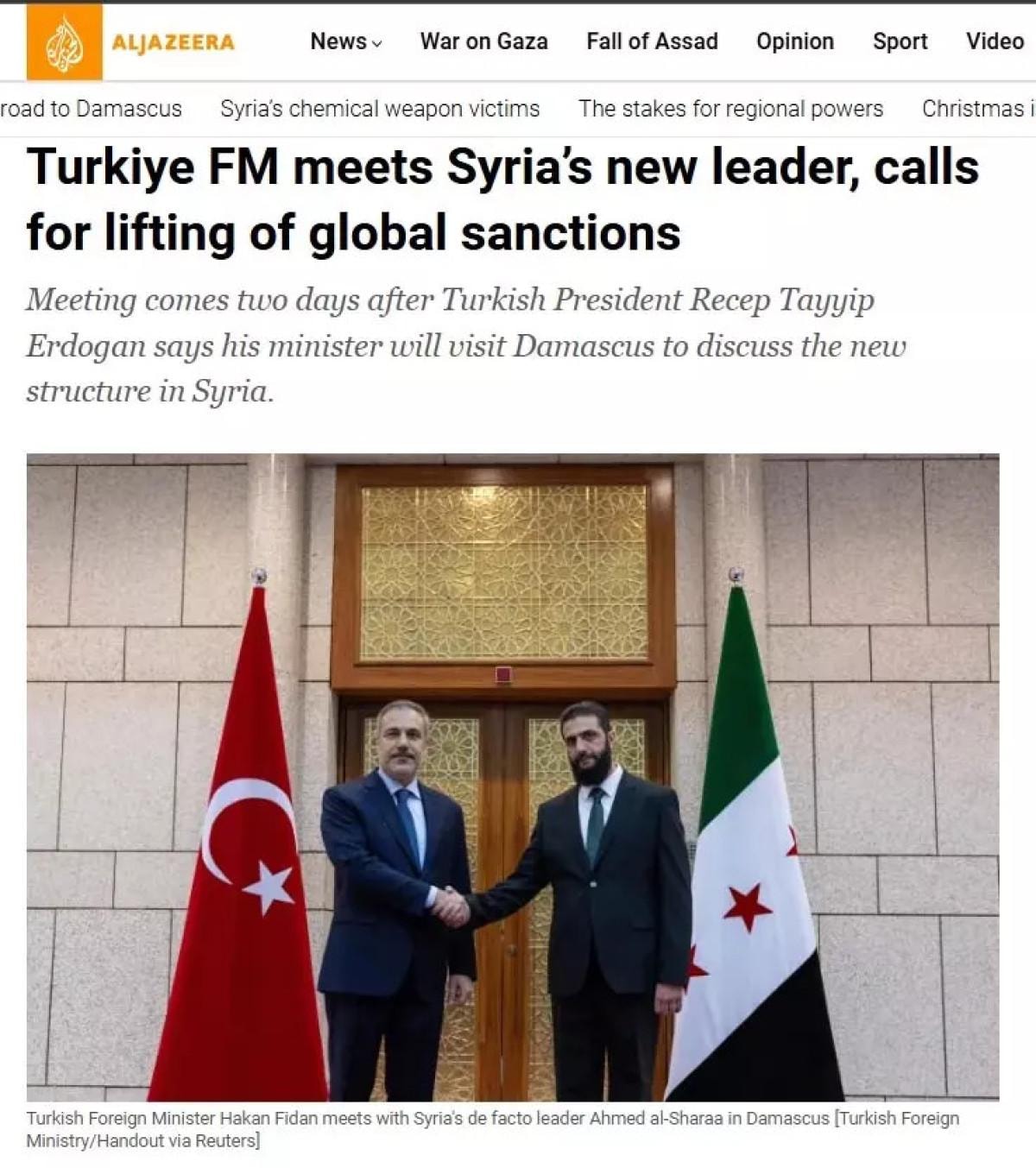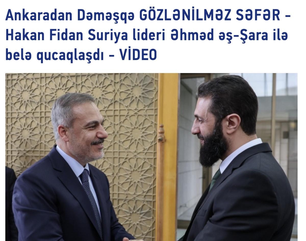 Tarihi görüşmeyi manşetlerine taşıyan Rusya merkezli news.az, habere, "Hakan Fidan ve Ahmed Şara, Esad'ın 14 yıldır ziyaret etmesini yasakladığı Kasyun Dağı'nı ziyaret etti" başlığını attı.