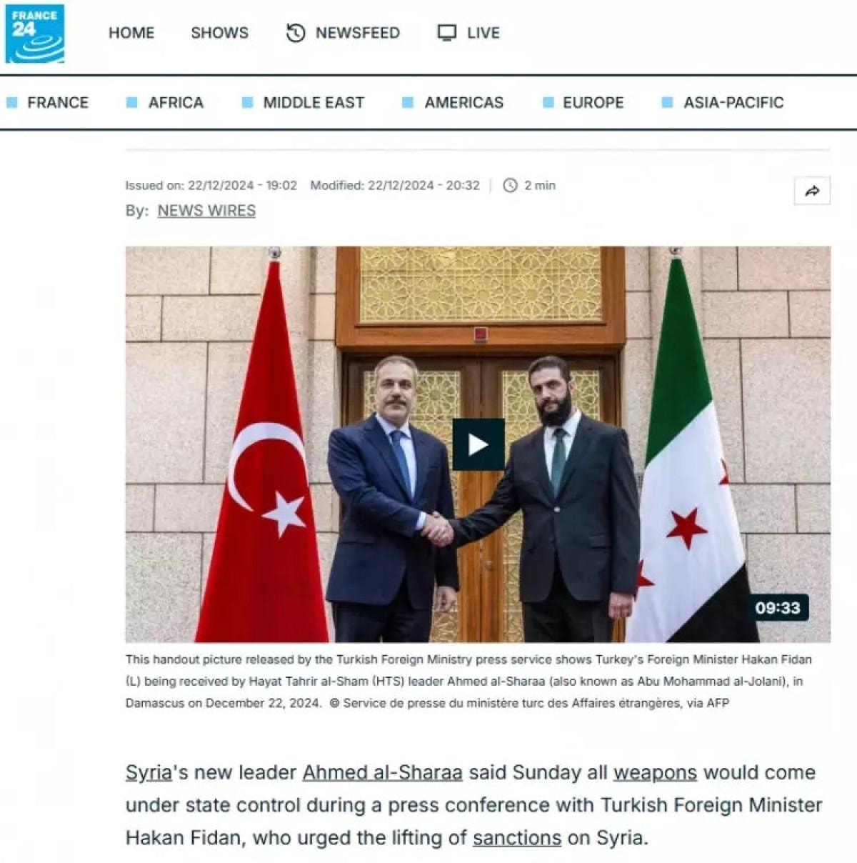France 24 kanalı, 'Dışişleri Bakanı Fidan Şam'da' sözleriyle görüşmeyi duyurdu.