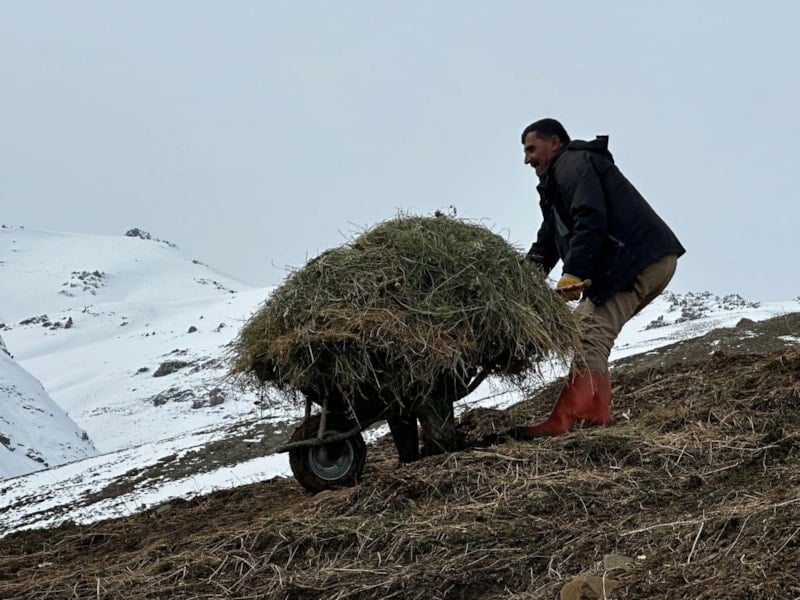 Yazın mera ve yaylalarda biçtikleri otları ahırlarına yakın bölgelere istifleyen köylüler, yemleri kar altından güçlükle çıkarıp bazen sırtlarında, bazen de eşek ve kızaklarla kar örtüsünün üzerine sererek hayvanlarını yemliyor.