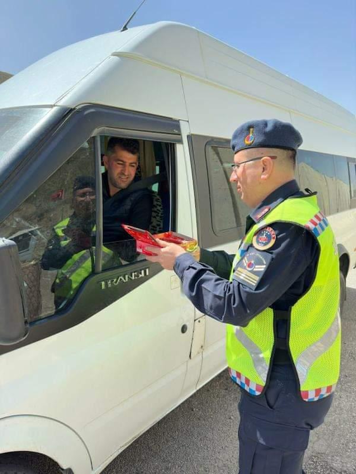 Durdurulan araçlarda vatandaşların bayramını kutlayan jandarma personelleri; sürücüleri kemer takmaları, yorgun ve uykusuz araç kullanmamaları ve hız yapmamaları konularında bilgilendirici broşürler dağıttı.
