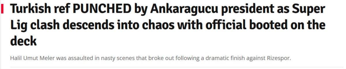 "Türkiye'de skandal... Kulüp patronu hakemi dövdü. Ankaragücü ile Rizespor arasında oynanan Süper Lig maçında (1:1) hakem Halil Umut Meler'e (37) çirkin bir saldırı gerçekleşti. Maçın bitiş düdüğünün ardından Ankaragücü kulüp başkanı Faruk Koca (59) sahaya koştu ve hakemin yüzüne yumruk attı. Hakem yerde yatarken, diğer iki kişi kafasına tekme attı. Hakeme korkakça dayak saldırısı..."