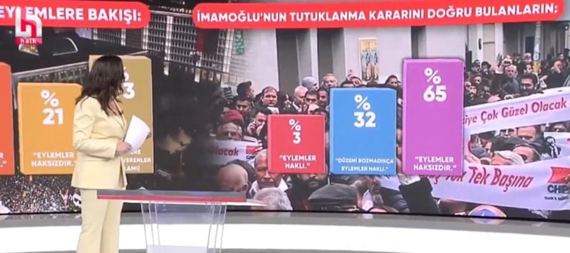 Canlı yayında yayınladığı ankette Ekrem İmamoğlu'nun tutuklama kararını doğru bulanlar arasında 'eylemleri haksız bulanların' oranı yüzde 65 olarak görünce Ece Üner'in dili tutuldu..