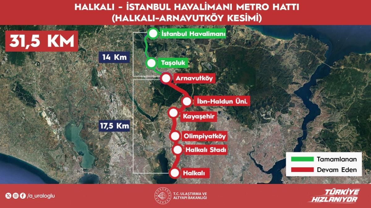 17,5 kilometrelik Arnavutköy-Halkalı hattında çalışmalara hızla devam ettiklerini söyleyen Bakan Uraloğlu, “Aslında biz bu kesimi de bitirdiğimizde Halkalı- İstanbul Havalimanı- Gayrettepe Metro Projesi adı altında; tamamı yeraltında olan metro sınıfında Türkiye’nin en uzun ve en hızlı, dünyanın da en uzunlarından biri olacak 69 kilometrelik bir ring hattını tamamlamış olacağız.” bilgisini paylaştı.