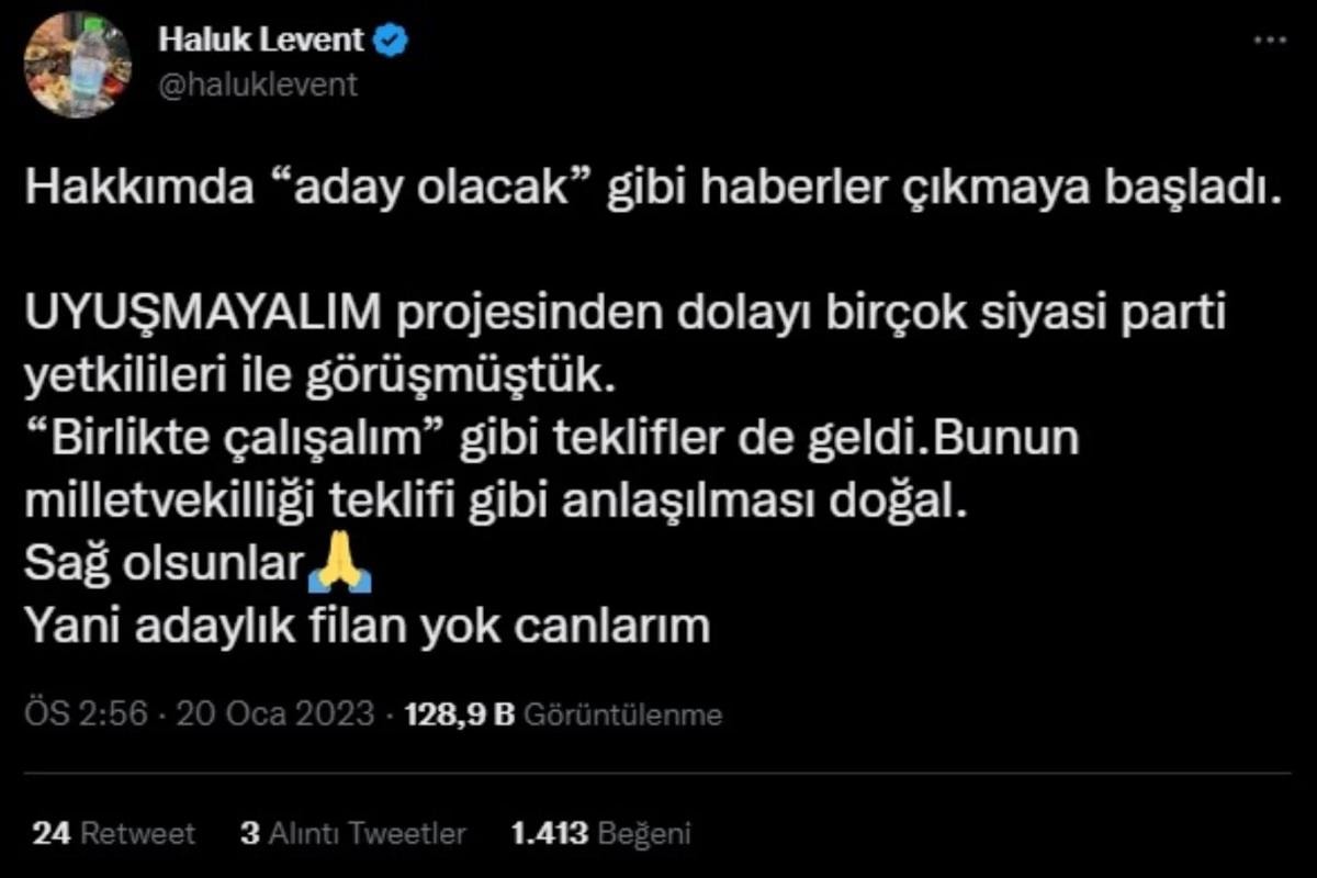 Milletvekili adayı olmayacağını duyuran Haluk Levent, açıklamasında şu ifadelere yer verdi: