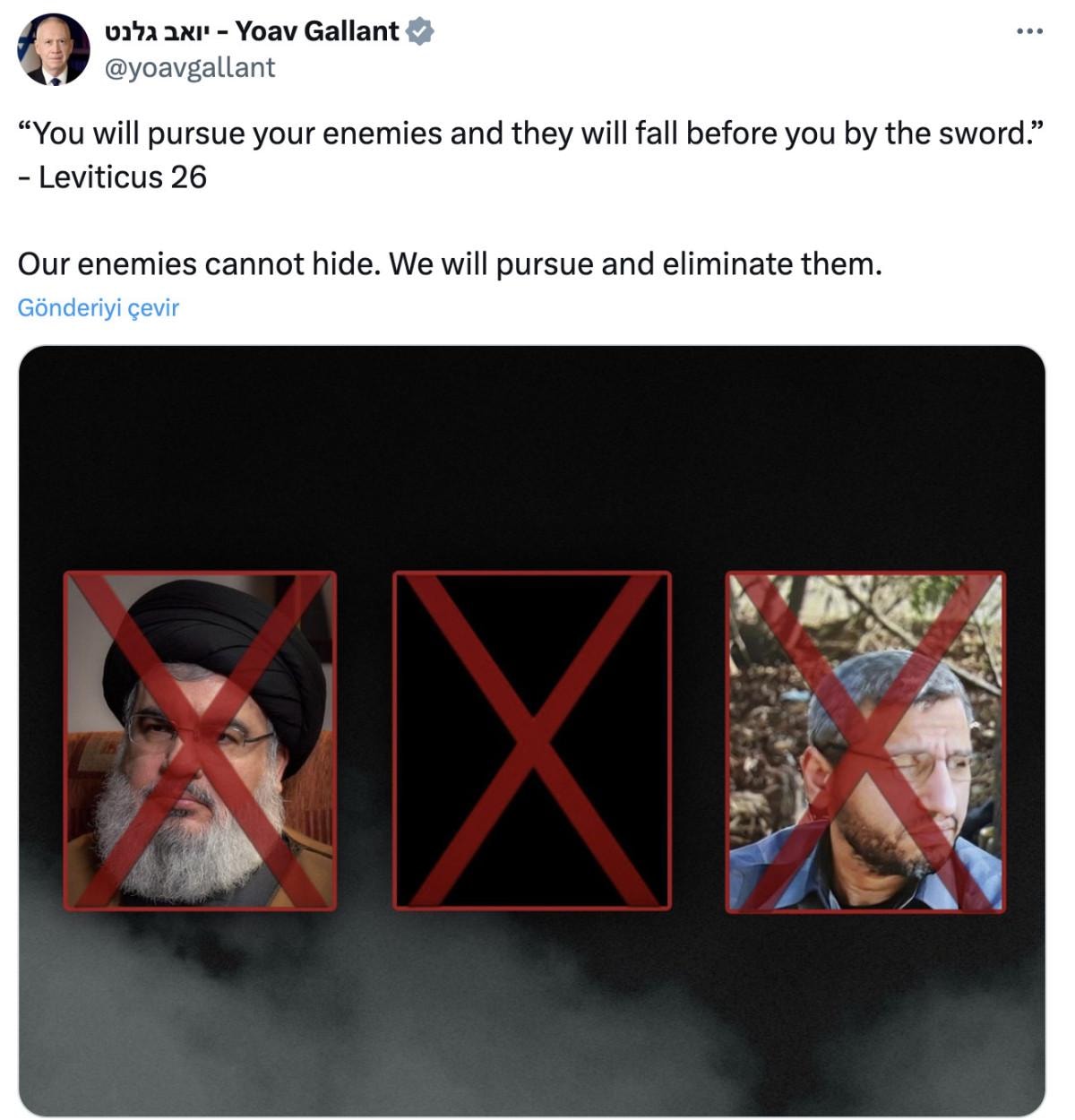 Hemen ardından İsrail Savunma Bakanı Yoav Gallant, X'ten yaptığı açıklamada Hizbullah'ın öldürülen lideri Hasan Nasrallah'ın ve Hamas askeri şefi Muhammad Deif'in fotoğrafını paylaşarak "Her bir teröriste ulaşıp, etkisiz hale getireceğiz" şeklinde bir paylaşım yaptı.