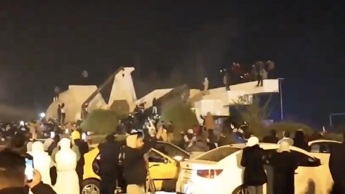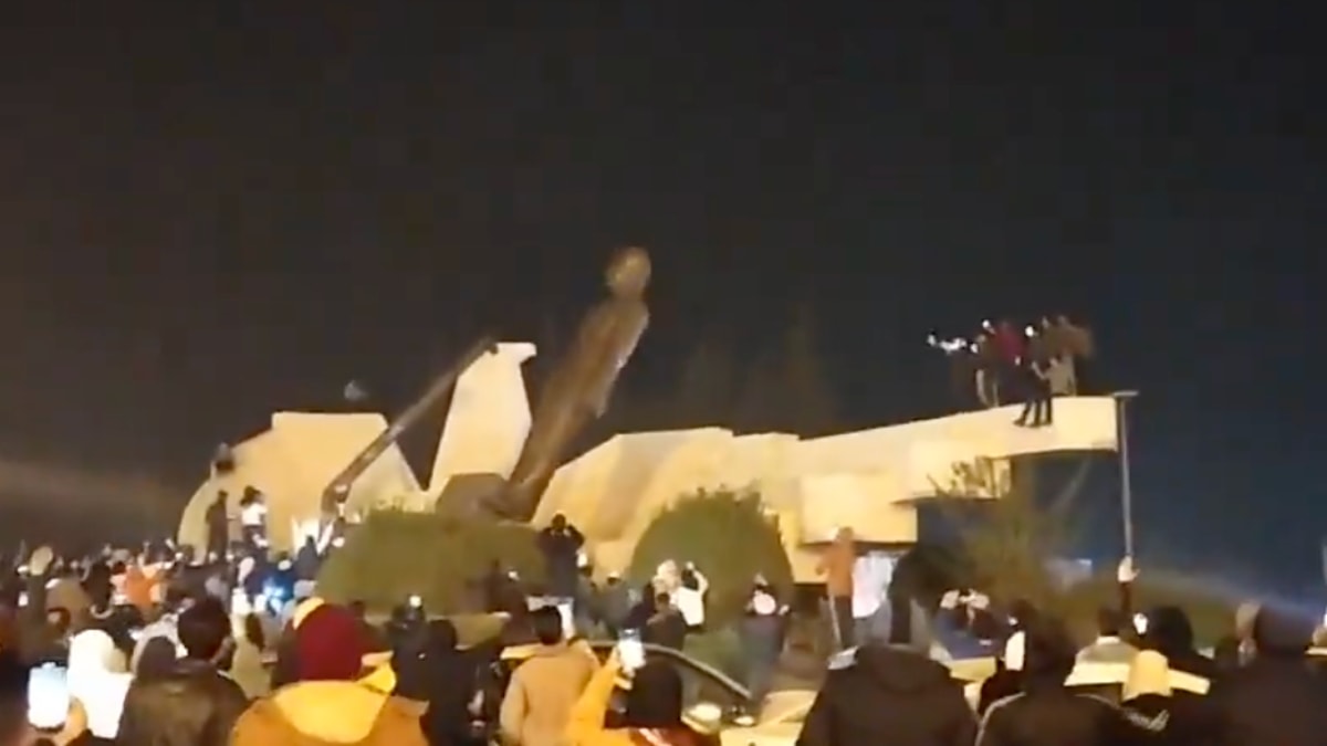 Heykelin vinçlerle yıkıldığı anlardaki coşku kameralara yansıdı.
