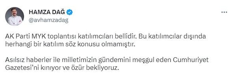 AK Parti MYK toplantısı katılımcıları bellidir. Bu katılımcılar dışında herhangi bir katılım söz konusu olmamıştır. Asılsız haberler ile milletimizin gündemini meşgul eden Cumhuriyet Gazetesi’ni kınıyor ve özür bekliyoruz.