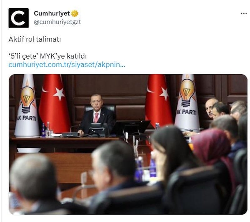 Bu kapsamda Cumhuriyet Gazetesi, AK Parti MYK Toplantısı hakkında “5’li çete MYK’ye katıldı” başlığıyla bir haber yayınladı.