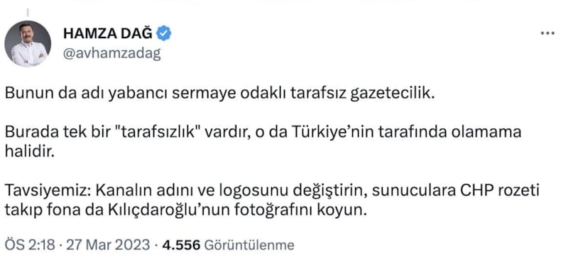 Bunun ardından AK Parti Genel Başkan Yardımcı Hamza Dağ, sosyal medya hesabında FOX TV'de gündeme gelen açıklamaya tepki gösterdi.