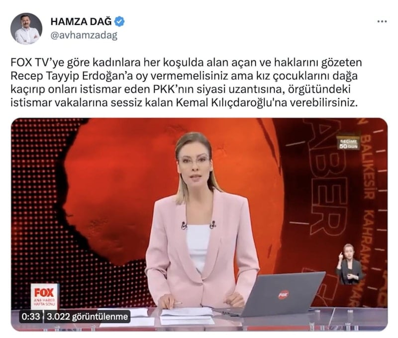 FOX TV’ye göre kadınlara her koşulda alan açan ve haklarını gözeten Recep Tayyip Erdoğan’a oy vermemelisiniz ama kız çocuklarını dağa kaçırıp onları istismar eden PKK’nın siyasi uzantısına, örgütündeki istismar vakalarına sessiz kalan Kemal Kılıçdaroğlu'na verebilirsiniz.