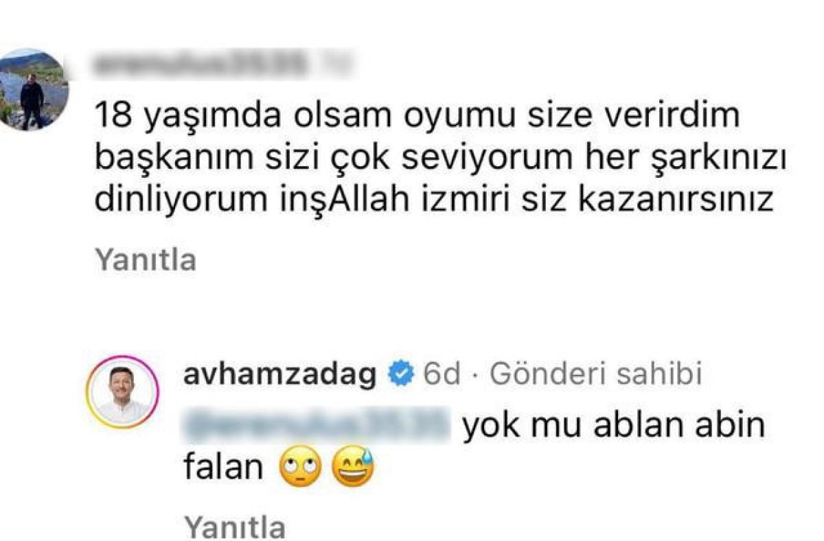 "18 yaşımda olsam oyumu size verirdim başkanım. Sizi çok seviyorum her şarkınızı dinliyorum. İnşallah İzmir'i siz kazanırsınız" yorumuna Dağ "Yok mu ablan abin falan" dedi.