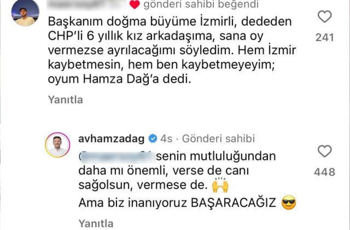 Bir vatandaş "Başkanım doğma büyüme İzmirli, dededen CHP'li 6 yıllık kız arkadaşıma, sana oy vermezse ayrılacağımı söyledim. Hem İzmir kaybetmesin hem ben kaybetmeyeyim. Oyum Hamza Dağ'a dedi" yorumunu yaptı.