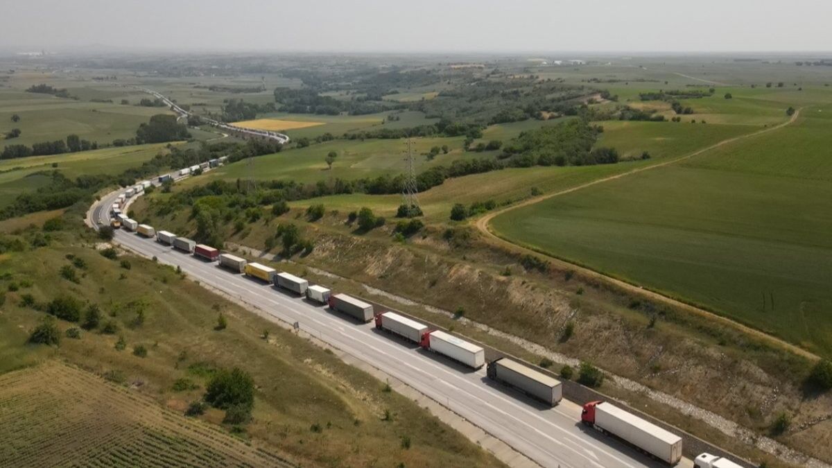 Sınırda oluşan 38 kilometrelik tır kuyruğu havadan görüntülendi.