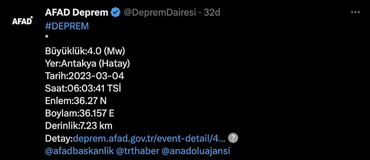 Hatay'ın Antakya ilçesinde saat 06.03'te 4 büyüklüğünde deprem meydana geldi. Afet ve Acil Durum Yönetimi Başkanlığının (AFAD) internet sitesinde yer alan bilgiye göre sarsıntı 7,23 kilometre derinlikte gerçekleşti.