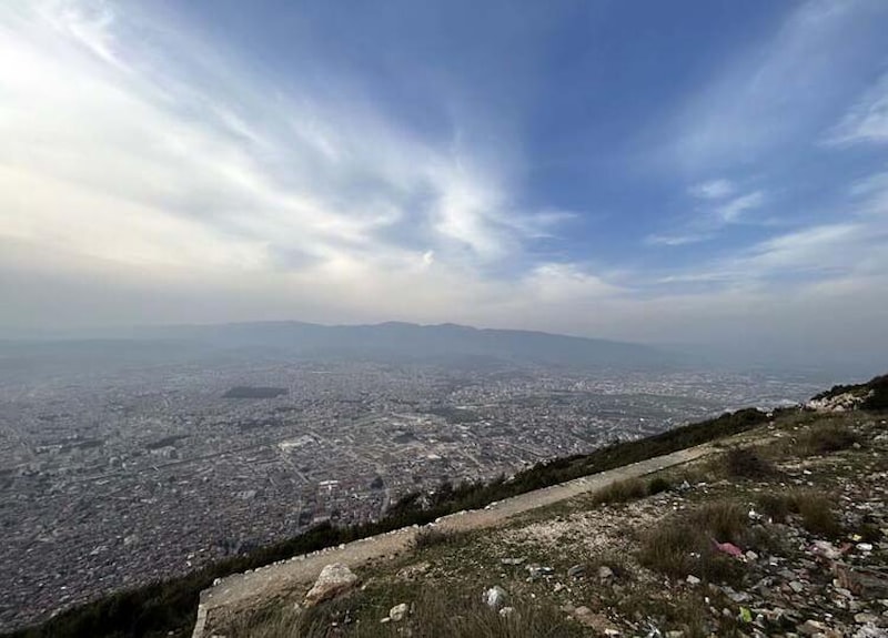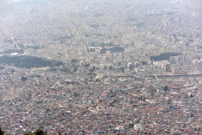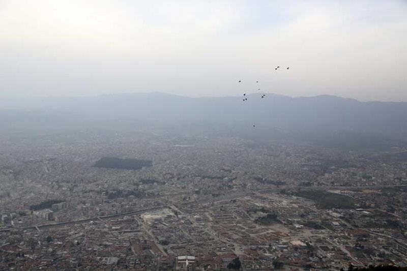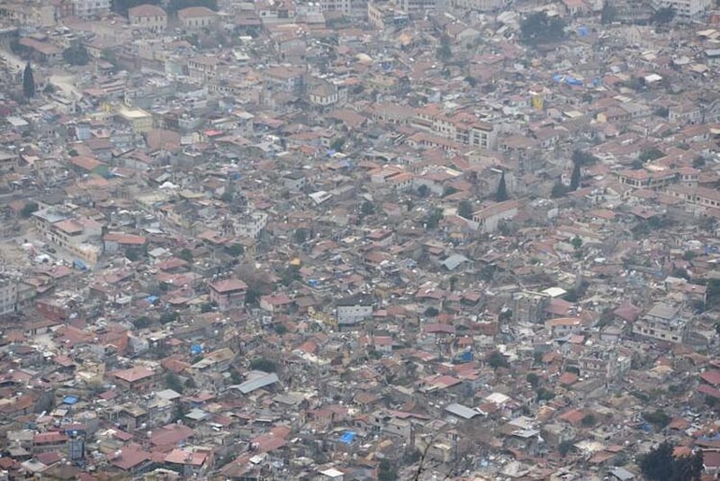 Deprem sonrası 60 bin bina için yıkık, acil yıkılacak veya ağır hasarlı tespiti yapılan Hatay'da, binlerce iş makinesi ve kamyon ile sürdürülen enkaz kaldırma çalışmalarında yükselen toz, kentin üzerini kapladı. Toz yoğunluğu, tarihi Antakya Kalesi'nden görüntülendi.