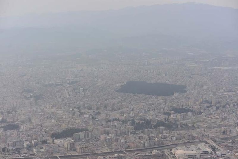 Binlerce iş makinesi ve kamyon ile enkaz kaldırma çalışmalarının gün boyu sürdürüldüğü Hatay'ın üzeri ise toz bulutuyla kaplandı.