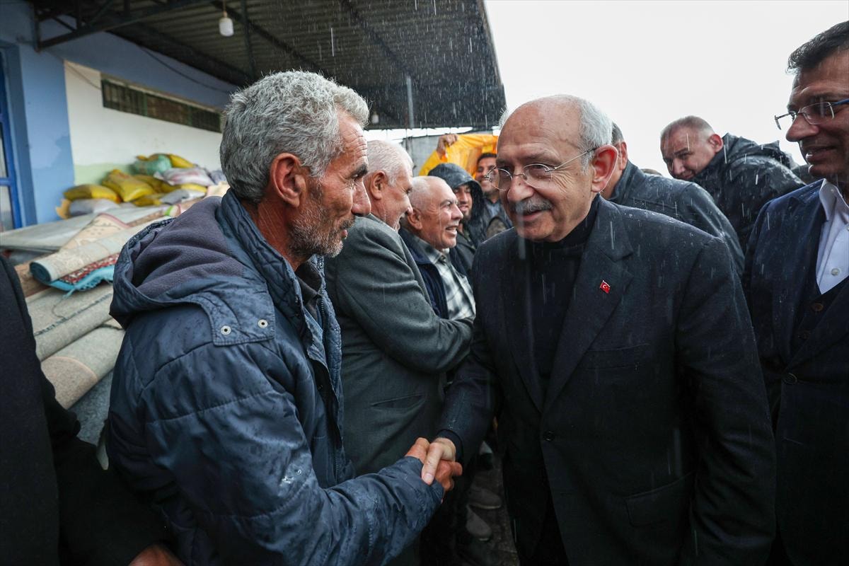 Burada yemekhane olarak kullanılan çadıra giren Kılıçdaroğlu, bir grup depremzede ile görüşürken, çok sayıda vatandaş da dışarıda yağmurun altında onu bekledi.