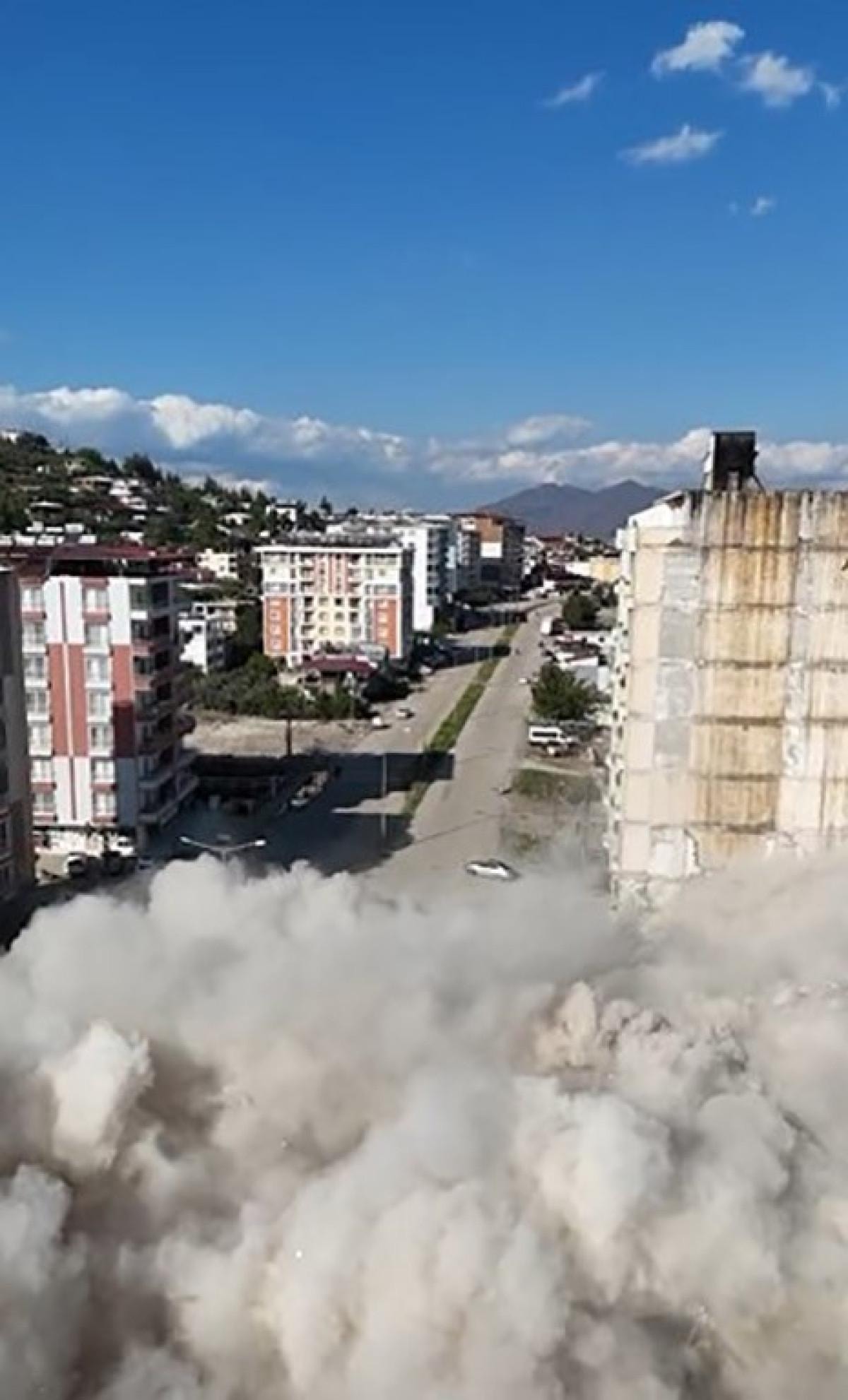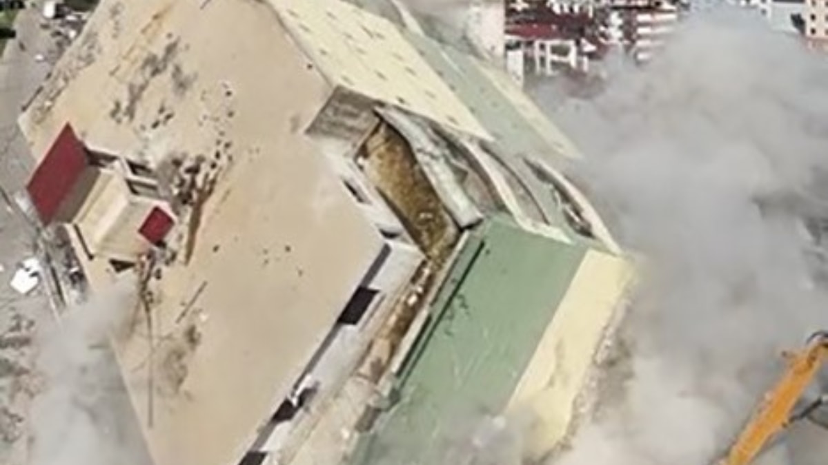 Yıkım sırasında çevrede güvenlik önlemleri alınırken, çökme anı dronla havadan görüntülendi.