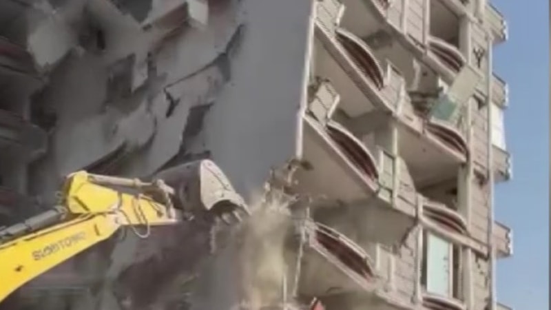 Antakya'da iş makinasının müdahalesiyle 2 ağır hasarlı binanın iş makinesinin darbesiyle yıkılma anları kameralara yansıdı.
