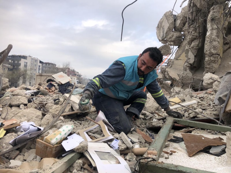 Burası 3 katlı bir dükkandı, 6 Şubat’taki depremlerde tam olarak yıkılmamıştı en son 6.4’lük depremin ardından yerle bir oldu. Biz de kurtarabildiğimiz eşyaları kurtarıyoruz. En alt kat tamamen camdı zaten orada hiçbir şey kalmamıştır.