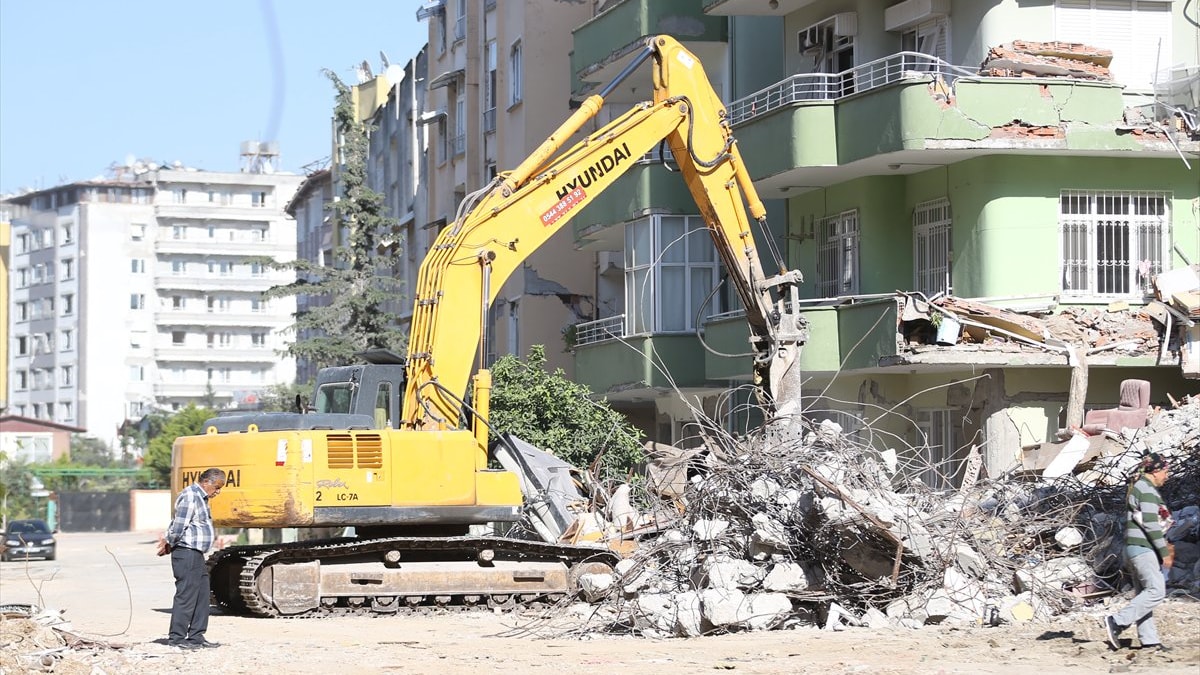 Kahramanmaraş merkezli depremlerden etkilenen Hatay'da, ekipler hasarlı binaların yıkımını sürdürüyor.