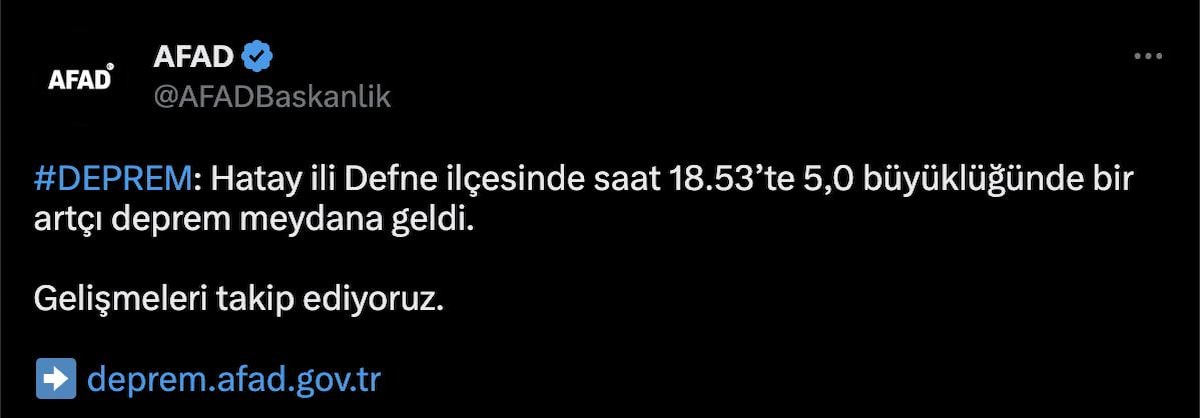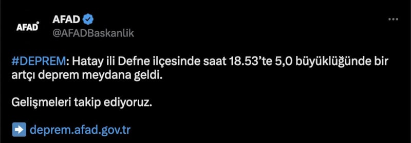 Son olarak Afet ve Acil Durum Yönetimi Başkanlığının (AFAD) internet sitesinde yer alan bilgiye göre, deprem saat 18.53'te Hatay'ın Defne ilçesinde yaşandı.
